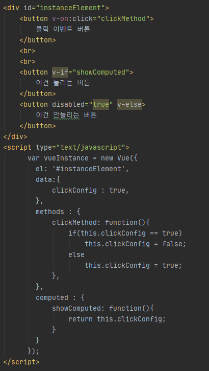 [버튼 이벤트 실행 -> clickMethod 함수 실행 -> clickConfig 값 수정 -> computed 감지 -> showComputed 실행 -> v-show 지시자가 결과를 받음 -> 화면 출력]