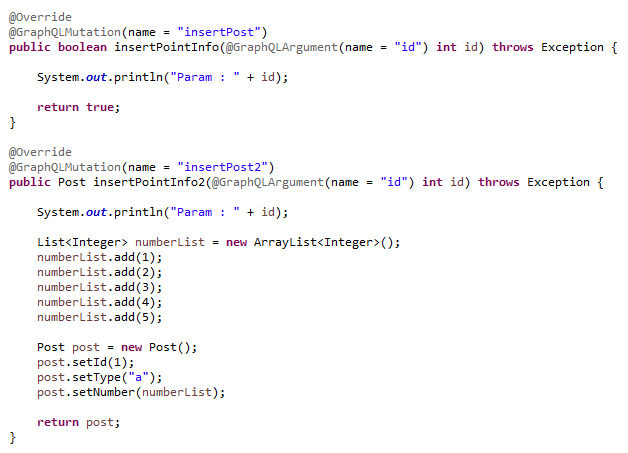 @GraphQLMutation annotation으로 해당 함수가 mutation 기능을 가진다고 명세한다.