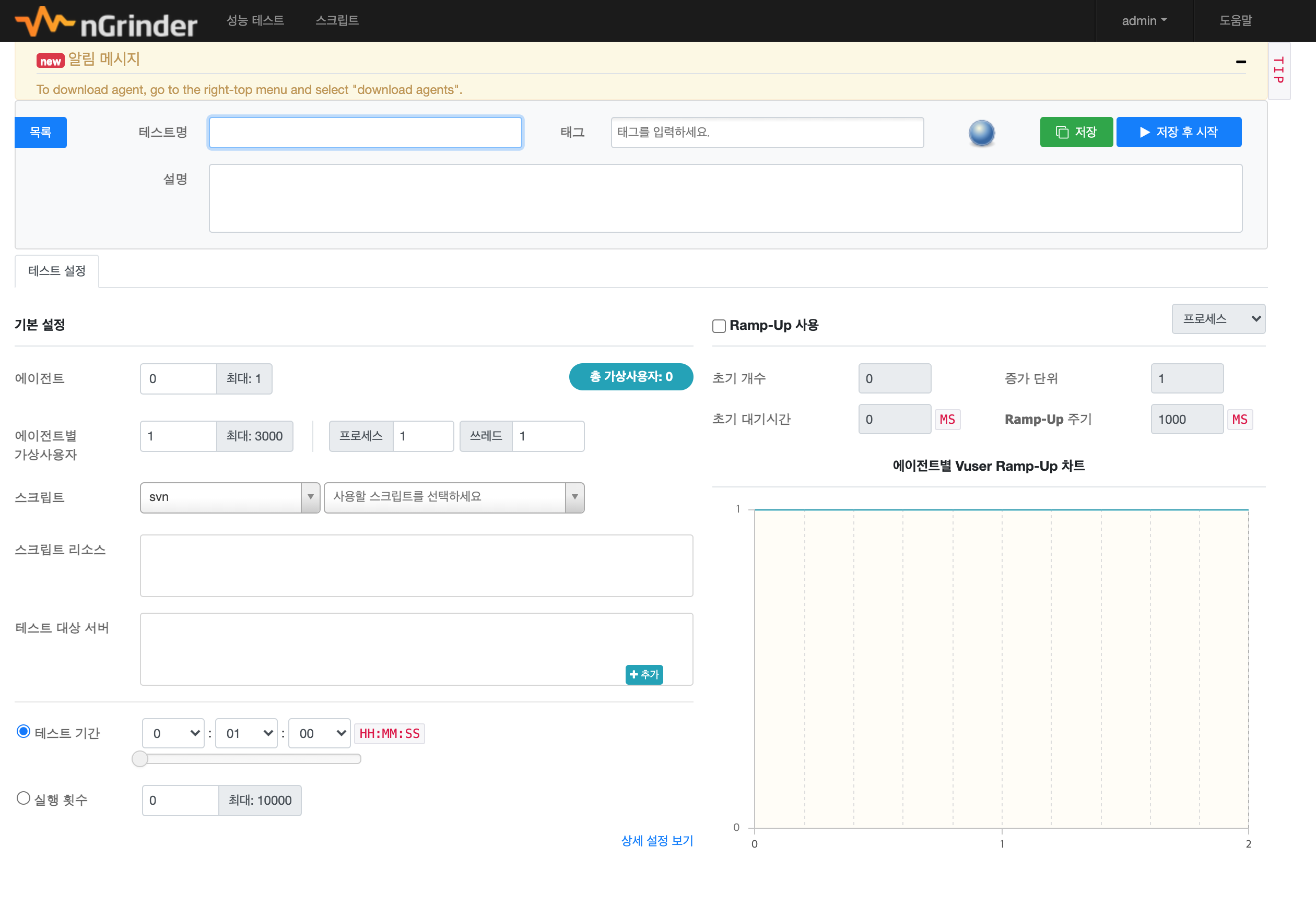 Controller 상단의 "성능 테스트" 탭을 클릭하면, 위와 같은 페이지에 진입하게 된다.