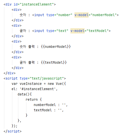 위 코드는 HTML input tag와 vue instance의 data를 맵핑 시켜놓은 것이다.